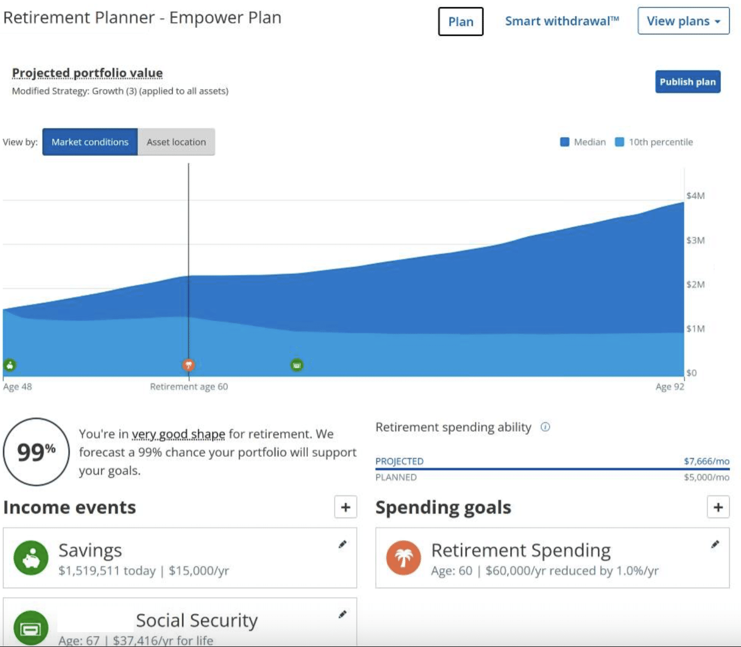 Finally, we wrapped up the call by reviewing what my retirement could look like starting at age 60, just 12 years from now, if I followed Empower’s recommendations. You can model similar scenarios yourself using their free wealth management tools by adjusting your own input assumptions.